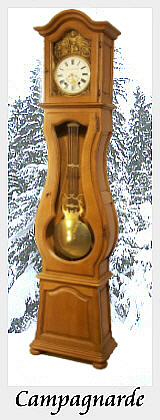 Tout comme la Louis Philippe, la Campagnarde est une Horloge Contemporaine, de style totalement opposé aux Comtoises. La structure est en 3 parties reliées les unes aux autres, la tête, le corps du milieu et le bas. Style moderne, avec ses parties galbées réalisées à partir de panneaux cintrés. Contrairement aux Comtoises, la grande porte est évidée au maximum. Sur ce modèle, les côtés du dessus ne s'ouvrent pas mais néanmoins peuvent s'enlever. Disponible en Merisier, Chêne et Noyer. (Cliquez ci dessous pour agrandir)