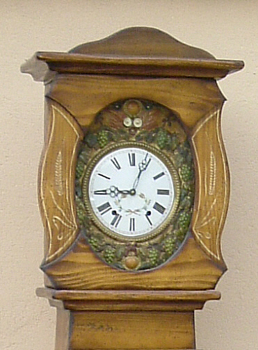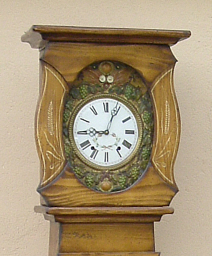 Sapin massif avec motifs peints main, cadran fleuri, aiguilles noires, fronton blé raisin peint.