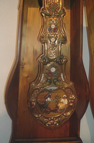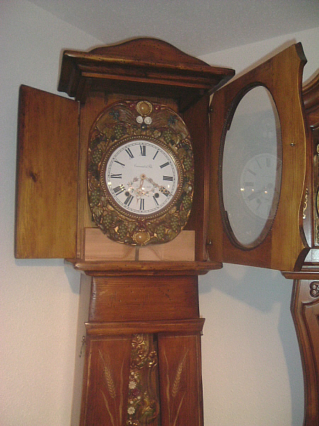 Sapin massif avec motifs peints main, cadran fleuri, aiguilles dorées, fronton blé raisin peint et balancier animé peint vigneron.