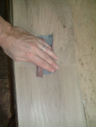 Finitions de la caisse : ponçage à la main pour l'aspect "vieilli" (au total 7 opérations), égrainage après avoir appliqué la teinte (3 opérations), application de la cire puis lustrage.
