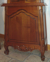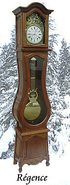 Modèle identique à la Campagnarde mais avec un style du bas spécifique. Horloge Contemporaine, de style totalement opposé aux Comtoises. La structure est en 3 parties reliées les unes aux autres, la tête, le corps du milieu et le bas. Style moderne, avec ses parties galbées réalisées à partir de panneaux cintrés. Contrairement aux Comtoises, la grande porte est évidée au maximum. Sur ce modèle, les côtés du dessus ne s'ouvrent pas mais néanmoins peuvent s'enlever. Disponible en Merisier, Chêne et Noyer. (Cliquez ci dessous pour agrandir)