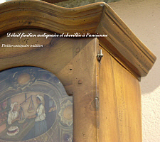 Cela consiste à "vieillir" à la partie ébénisterie de nos Comtoises pour donner un aspect rustique. Ce procédé manuel, est obtenu selon nos techniques artisanales et représente un long travail de patience. Plusieurs degrés de finitions vieillies sont proposées, plus ou moins prononcés, selon les goûts ou encore selon votre choix. Avec ou sans chevilles à l'ancienne.