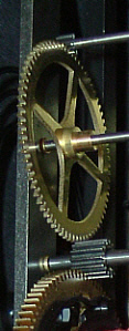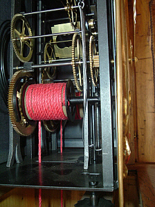 Il fonctionne grâce à l’attraction de deux poids en fonte d'environ 3,8 kg chacun, reliés par deux ficelles aux rouages du mécanisme et par l’oscillation d’un balancier. Ce dernier sert de régulateur et sa longueur permet de régler l'avance et le retard. Le poids droit pour les sonneries et le gauche pour les heures. Les poids se remontent par le biais d’une manivelle à partir du cadran et ont une autonomie de 8 à 10 jours.